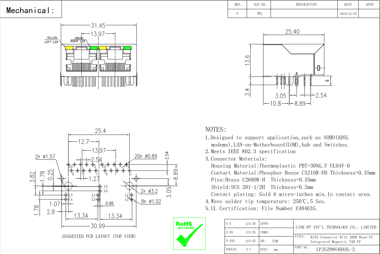 The LPJ19113DNL supports speed 10/100 Base-T, It is compliant to IEEE 802.3, UL, Reach, RoHs, ISO19001,ISO14001 standards. It can be used to support application, such as Smart Home, Smart Meters, hub and Embedded Main Board.