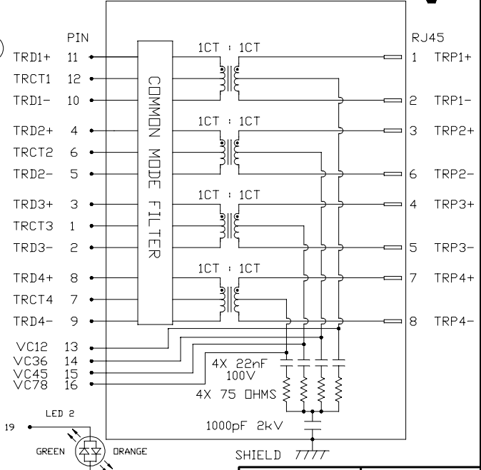 0826-1X1T-JK-F 1x1 Port 5G Base-T RJ45 MagJack Electrical Schematic: