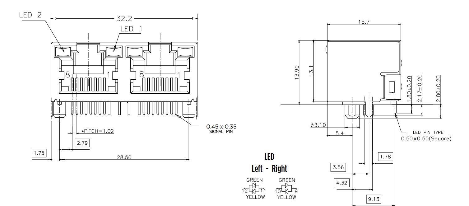 E5J88-41LHS4-LT CAT5e 1X1 Port RJ45 Magnetic Connectors Tab Down With leds Images |